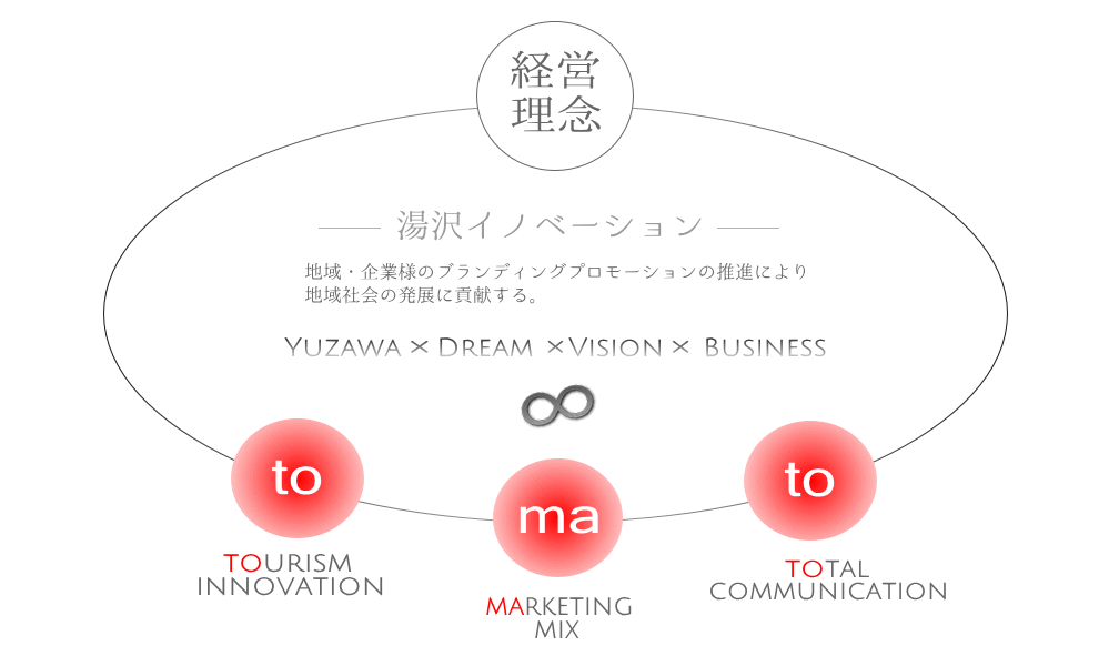 ![]() 【tourism innovation】 観光業の発展と振興を中心にした観光ビジネスソリューション 【marketing mix】 プロモーション(広告・宣伝・PR)を軸とした戦略的マーケティング 【total communication】 地域資源を活用したイベントや商品開発などのコミュニケーション |