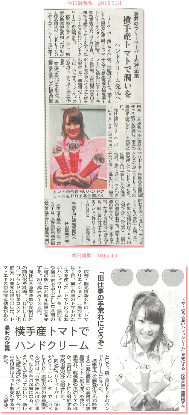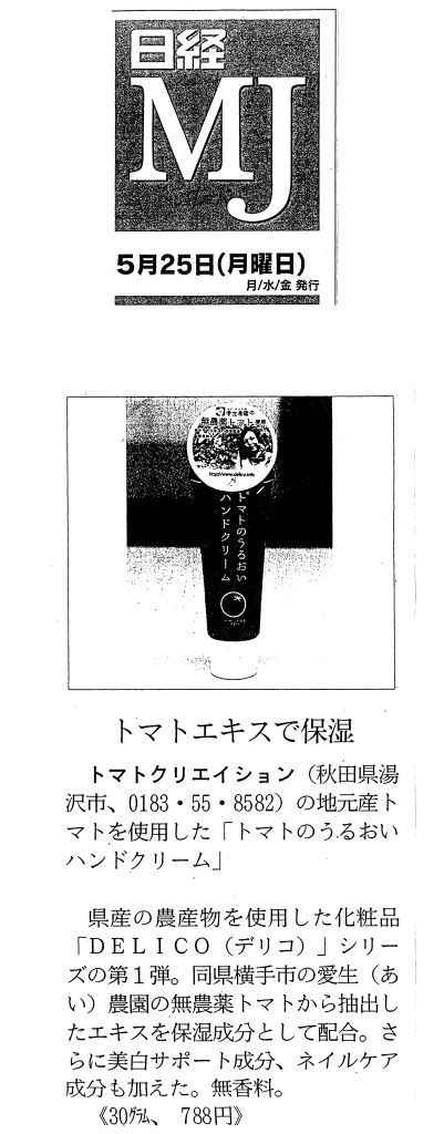 販売は終了しました。 地元のおいしいをコスメで伝える。 化粧品ブランド delico 第1弾商品 「トマトのうるおいハンドクリーム」 【販売店箇所】 【湯沢市内】 道の駅おがち、虹こまち、秋の宮山荘、トマトクリエイション 湯沢市観光物産協会まるごと特産館 小安峡温泉(多郎兵衛旅館・元湯くらぶ・秋仙・こまくさ・松葉館・鳳・鶴峯館・山の抄・阿部旅館・重右衛門)、 かえで庵・喜久屋 【横手市内】 道の駅十文字、秋田ふるさと村売店、横手市ふれあいセンターかまくら館 【秋田市】 アロマの庭 湯沢市ふるさと納税返礼品に指定されました。→こちら 2016/4/1 @cosmeに登場しました。→こちら 2015/4/17 yahoo!shoppingで販売を開始しました。→こちら 2015/5/21 日経MJ 5月25日 ![]() ![]() ![]() |